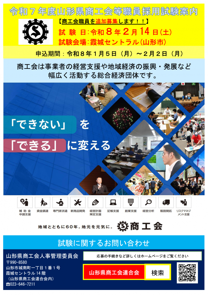 山形県商工会連合会では、令和8年度4月採用職員の追加募集を実施しています。商工会は、地域の事業者の経営支援や地域経済の振興・発展など幅広く活動する総合経済団体です。地域の「できない」を「できる」に変える、やりがいのある仕事に挑戦しませんか。【募集期間】令和8年1月5日(月)〜令和8年2月2日(月)【試験日】令和8年2月14日(土)【試験会場】霞城セントラル(山形市)【応募方法】詳しい応募手続きや受験資格等については、山形県商工会連合会ホームページをご覧ください。【お問い合わせ先】山形県商工会人事管理委員会〒990-8580 山形市城南町一丁目1番1号霞城セントラル14階(山形県商工会連合会内)TEL:023-646-7211【PR動画公開中】商工会職員の仕事内容ややりがいを紹介するPR動画を公開しています。動画URL:https://youtu.be/x0ix8t7c6dc地域経済を支え、事業者に寄り添う仕事に興味のある方は、ぜひご応募ください。皆様のご応募をお待ちしております。