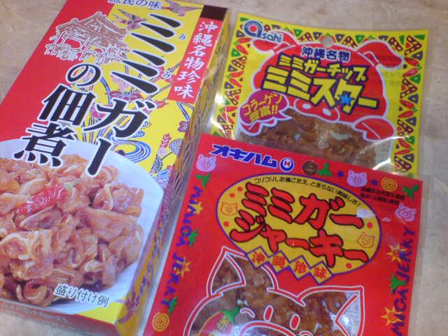 ミミガーの佃煮にミミガーチップ、ミミガージャーキー・・。