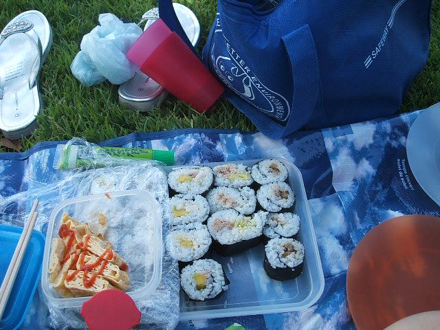 近くの公園に行きました。暑かったのに人がけっこういたけど、木の下は以外に涼しかった。寿司をいっぱい作った!二人で3合は食べすぎ?
