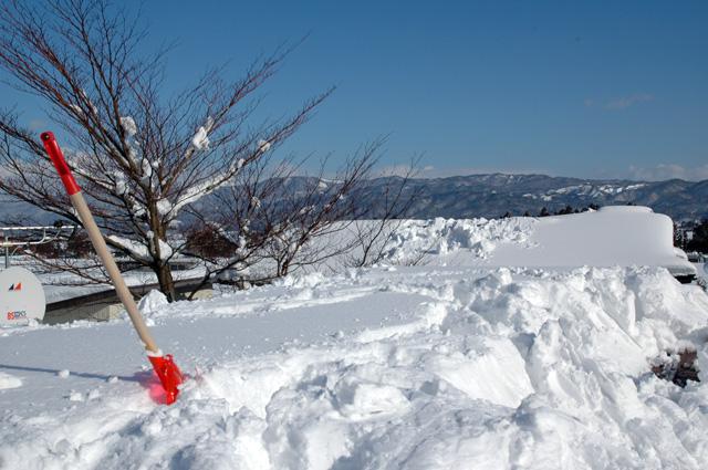 雪国でない人のために解説すると、積雪の多い地域に住む人たちは、雪の重みで家屋が潰されてしまわないように、頃合いを見計らっては、こんな風にスコップやスノーダンプで屋根から雪をおろさないといけないんですね。