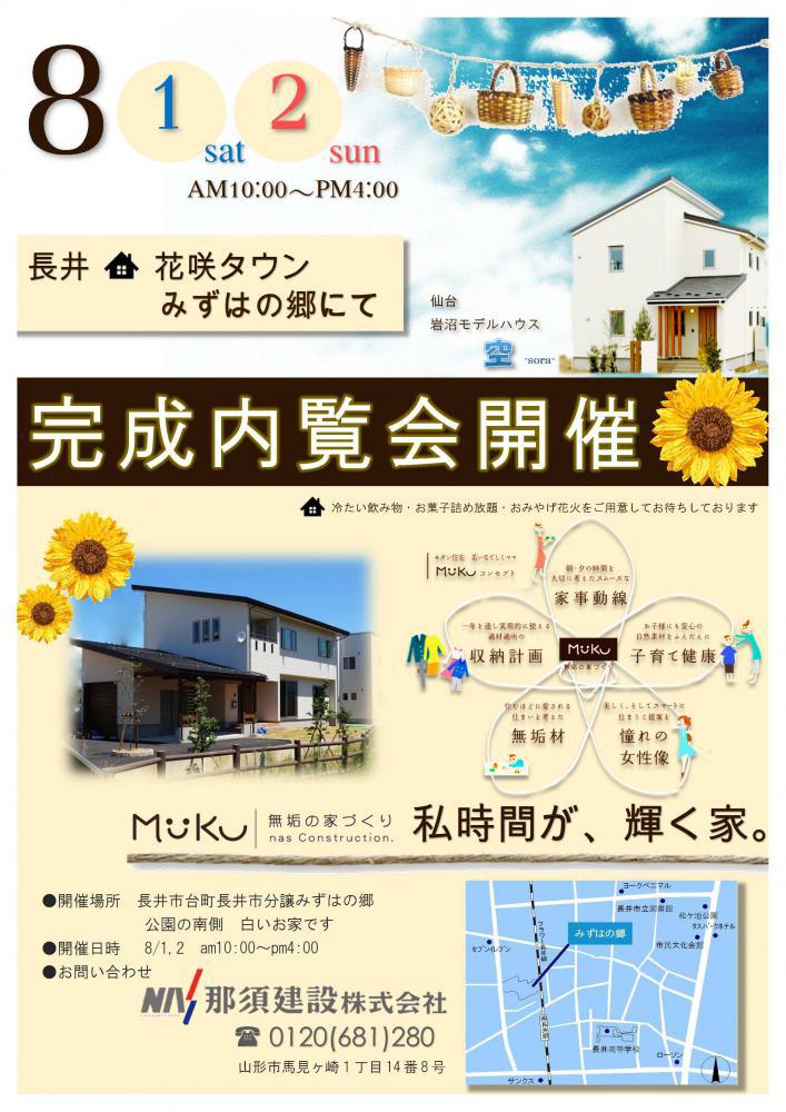 梅雨も明け、毎日本当に暑いですね。子どもたちは夏休みが始まり朝から賑やかな声が聞こえてきます〜♪さて、山形支店では今週末に完成内覧会を開催いたします。お客様のお家をお借りしてのイベントとなりますのでより現実味のあるお家を見て頂けると思います。ぜひ、この機会にご見学ください。■開催場所 長井市台町804番30 (花咲タウン みずはの郷)■開催日時 平成27年 8/1(土)、8/2(日) 午前10時から午後4時まで■お問い合わせ 那須建設株式会社 山形支店 0120(681)280 まで担当:小林 由佳