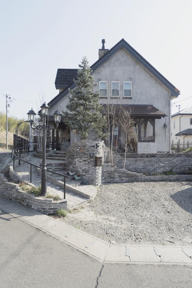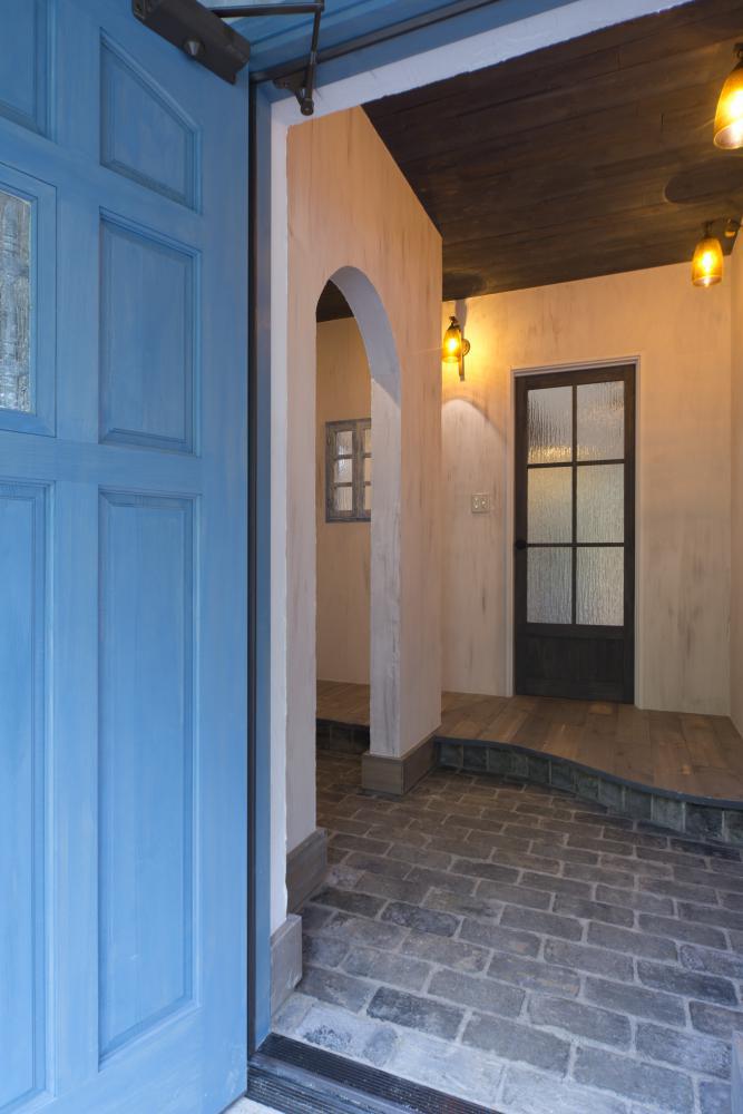 スカイブルーの輸入玄関ドアが目を引きます。