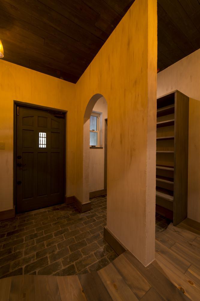 まるい垂れ壁が印象的な大容量のシューズクローク。