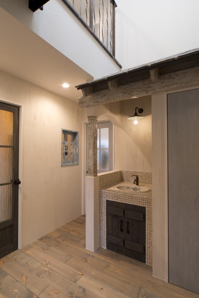 吹き抜け空間の中にある、洗面台。
