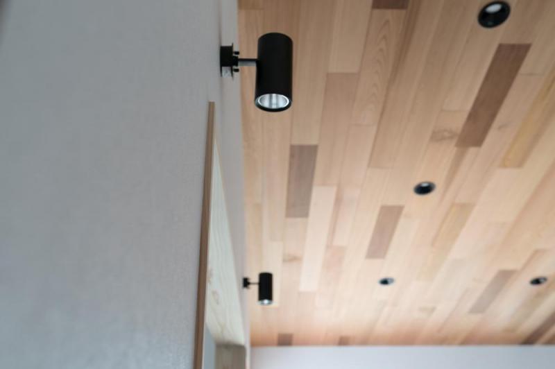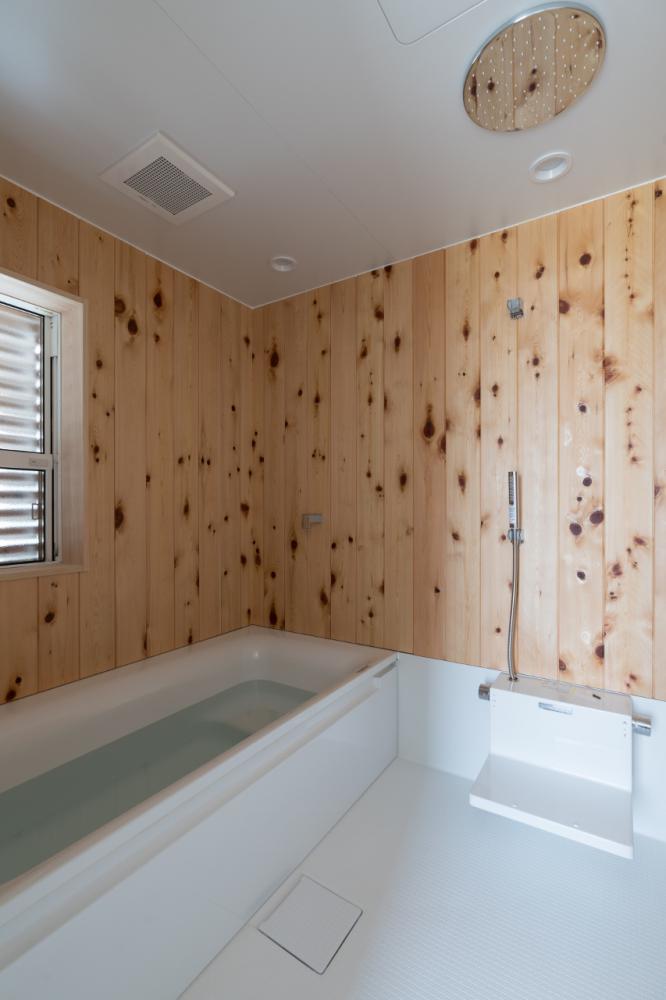 檜板張りのハーフユニットの浴室にはオーバーヘッドシャワーを装備