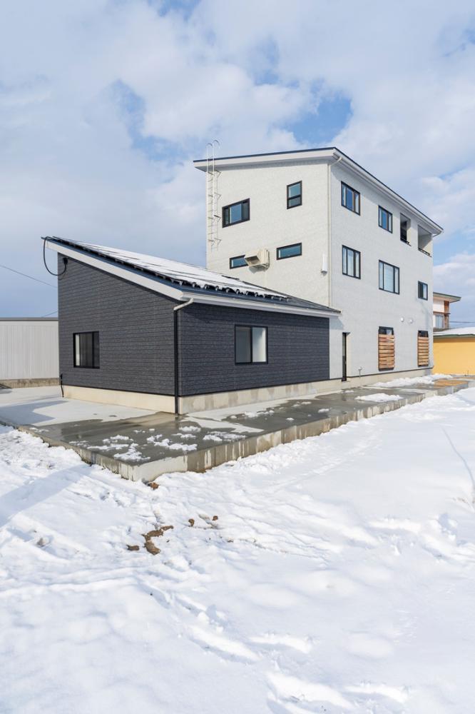 3階建てでホワイトとグレーの2色のコントラストが青空に映える外観。1階にはガレージを設け、雪の日も安心。LDKの一角には小上がりスペースも。#シンプル #モダン