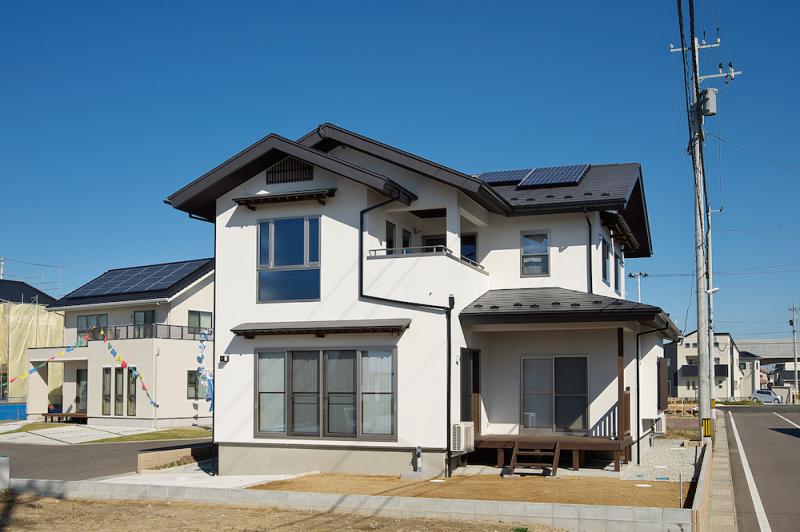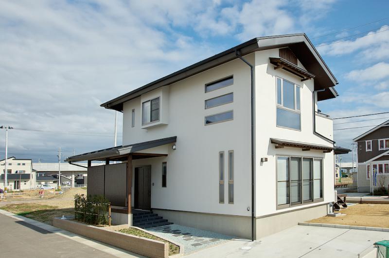 玄関ポーチに配置した木目のルーバーが和の趣を演出しております。