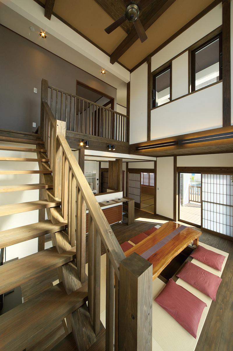 #古民家風#和モダン開放的な吹き抜けの中、リビング階段で2階に上がっていきます。