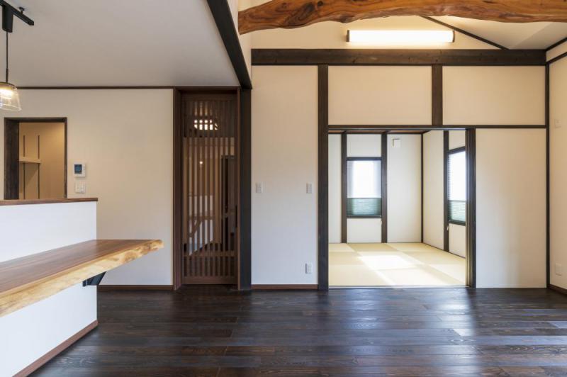 【岩沼市】M様邸岩沼市に、古民家風の平屋住宅が完成致しました。お施主様自らご選定された、化粧太鼓梁の日光杉。ダイニングカウンターは、♪この木 何の木♪で有名な葉を日の出とともに開き、午後になると閉じるネムノキ属のモンキーポッドです。テレビボードに使用したのはギターの側面によく使われるパドック。鮮やかな赤が印象的です。和室は塗り壁です。床の間のみアクセントで色味とコテ仕上げを変えて櫛引きに。お施主様の家づくりのこだわりが随所に見受けられる一邸です。無垢材のぬくもりと癒しの香り溢れる空間をご覧くださいませ。企画営業 大津 #リビング