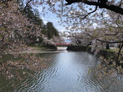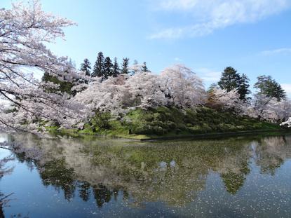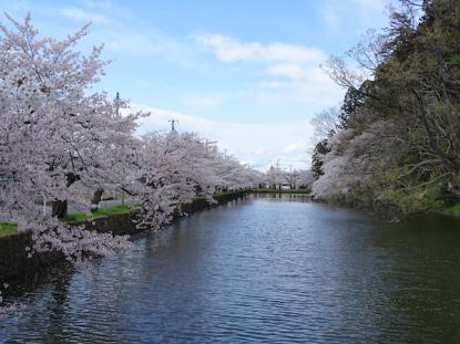 米沢市の松が岬公園の桜も、お堀沿いに200本の桜が咲き誇る様子は