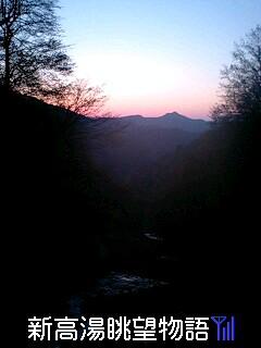 手前が渓流、そして夕焼けにケータイカメラのレンズが光線負け?! 必撮の間合いは“難しいでしゅ”→ザブングル風??