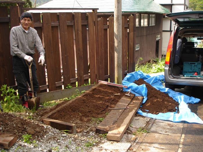 白布の花壇職人、カリスマガーデニストのMさんです。彼の手にかかれば造園、大工仕事、左官仕事、何でもござれ、素晴らしい感性と技をお持ちです(本業は別ですが)。今日も雪で壊れた花壇をメンテナンス!