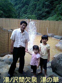 画像は間欠泉が丁度吹き出たところで、湯の華館主・伊東さん記念写真して頂いた娘。bPとElizabethV