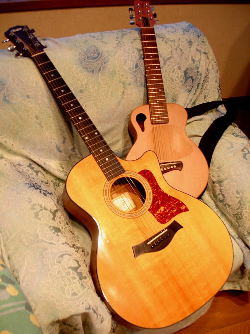 大きいのは愛用のテイラー314CE。小さいのはタコマパプーズP1です。お父さんと息子みたいな図ですね。いや息子も結構良い音で鳴ってくれます。
