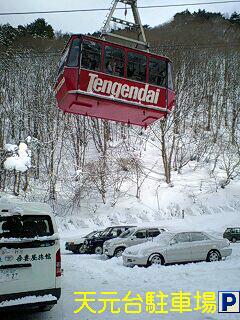 冬は天元台駐車場に駐車頂き新高湯温泉までは送迎車(Enterprise号)で【宿泊ONLY】 その駐車場とロープウエイとの位置関係はご覧の通りです。!(^^)! ロープウエイは20分間隔なので、このアングルだと最大20分待つ必要がありますが、コレは偶々です。