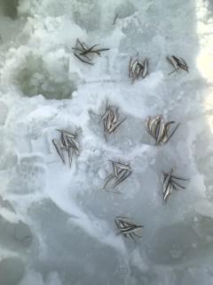 前日の穴へ、結果はご覧のとおりでした。今年は本当に 水窪ダムの完全氷結は無理かも、とにかく暖かいです。漁場もズブズブ状態です。危険地帯が日に日に増えてきてます。心配ですが どうにもできません。あと何日出来るかです。本日の釣果は 80匹プラス頂き物14匹でした。