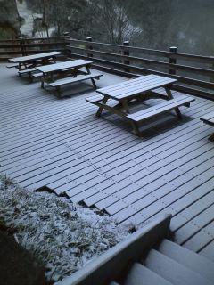 昨日の寒波が 朝のテラスを薄っすらと白くしました。