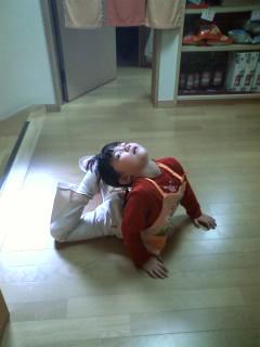 ヨガのポーズなのか? 体育の柔軟技なのか?? 埼玉の優衣姫に教授されたポーズを完璧にマスターした娘。bQは所構わずにポーズを決める。これはヨガ??? 前屈でも頭と足をつけるのは至難。 よもや、サバ折系ではワタシは不可。 正しい(と思う)柔軟技は風呂上りがタイムリー。