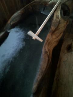 通称 「湯揉み棒」といいましす。山の宿の使い方は皆様がよく知られているかの有名温泉の「湯揉み板」とは使い方が多少違いがあり 単純に湯の温度調整に使います。この棒で温泉をかき混ぜて湯舟内の温度を均一化する棒です。けしてこの「湯揉み棒」で温泉をかき混ぜると湯舟内の湯が虹色になるような事はありません。どうぞ 来館入浴の際はご使用ください。