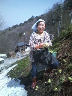フキノトウ採取に精をだすゲゲゲさんです。手前に残雪、そしてフキノトウ(#^.^#) 山奥ならではの光景です。