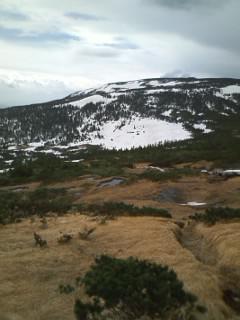 2日前の時です。残念ながら山頂はガスで見えませんでした。残雪がかなりあり凡天岩までのルートは雪の上になります。軽アイゼンがあるとグット