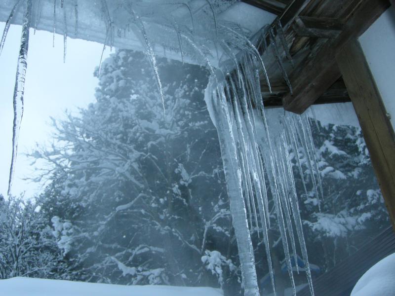 冬になると軒下のつららがドンドン伸びます。時々たたき落とさないと重たくなって軒先が壊れます。先端恐怖症の方にはたまらない光景でですね。