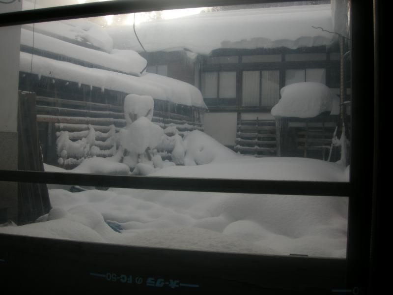 当西屋旅館の中庭、今朝のナイロン越しの風景です。なんでナイロン?いや、窓そのままだと寒くて寒くて大変だからナイロンを張ったのです。