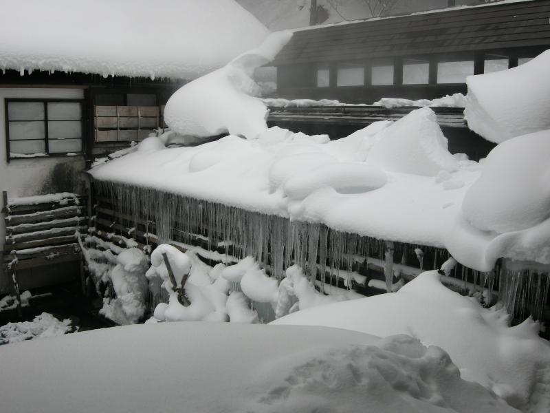 お風呂から流れたお湯で屋根から落とした雪を消しています。