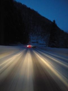 日中消えた道路の雪。消えたはずなのに、夕暮れと共にまた道路に戻ってくる。 だからこそ、山奥の宿への到着は夕暮れ前が基本です。