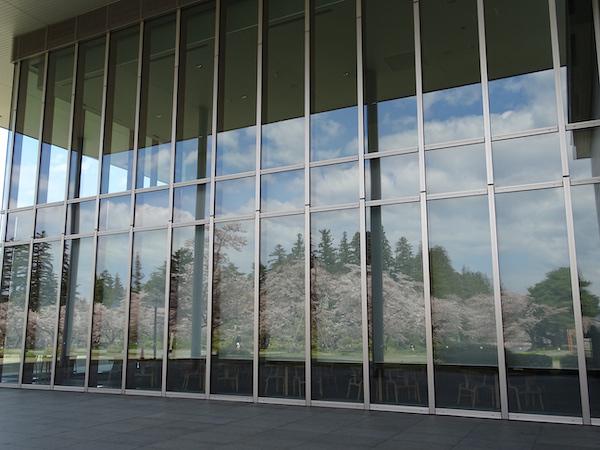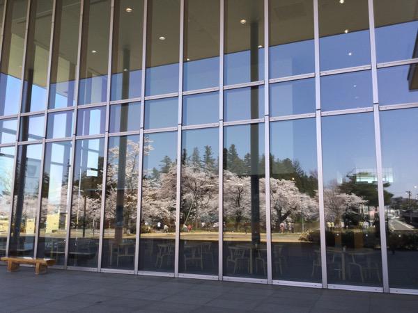 休館中の伝国の杜の全面ガラス窓に映る桜です。