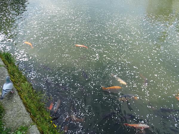 お堀に浮かぶ桜の花びらと鯉