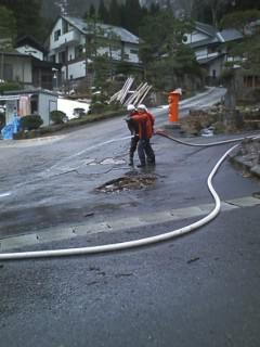 白布温泉内、春の共同作業。白布の奥より参加するセガールは、自警消防所有のポンプにて県道周囲をウォッシュ作業。相棒である“不動のS平”と共に放水の先端の役目を2時間半従事してきました。今回、必撮してくれたのは、西のエリック。東のK次郎は会合に出席のためクロファードで下界に下りていきました。