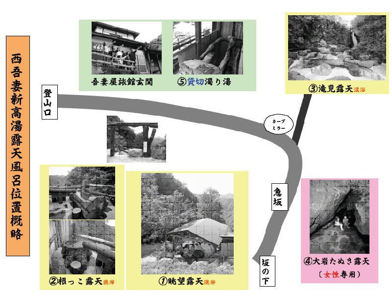 はい。そういうわけで西吾妻山中腹に陣取る新高湯ワールドのアミューズメント露天風呂が(掘り出して)出揃いましたので、ザクっと概略図を作成しました。