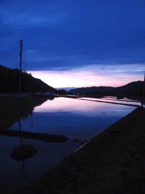 トワイライトは山や海だけでなく、まるで湖のように田んぼだって輝かせる。この辺りは、例年より10日ほど田植えが遅れており、ここ2,3日が田植えシーズン。 田には水がはられひんやりとした風が吹き付ける夕暮れ時。