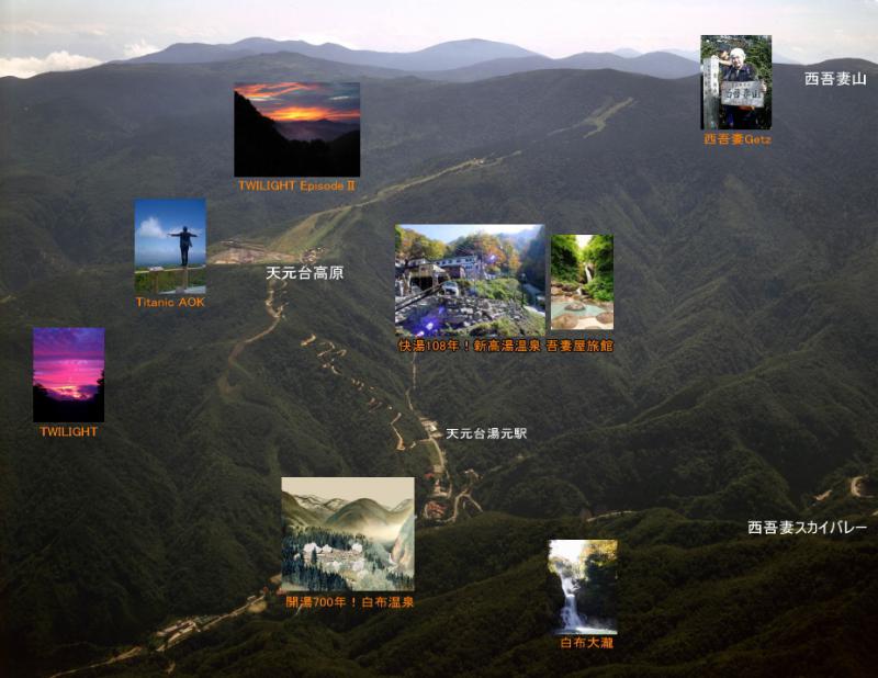 以前より公開しております天元台高原鳥瞰図に写メ画像などを落としこんで脚色しました鳥瞰マップです。 白布開湯700年バージョンと言いながらも、位置関係的にダーマエならぬユカタンシがセンターポジション セット♪