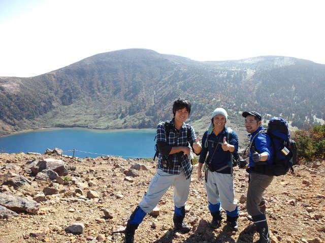 10月14日 米沢市山岳遭難対策員会の実地研修で東吾妻エリアを堪能して参りました。画像は「五色沼(ごしきぬま)」を背に、 ザック、太一、S兵の3名は感激のあまり目がうるうるしておりました。ワタシは白布天元台隊をS兵と共に代表しての参加。他にも、市民山の会の皆様、米沢警察署、米沢市消防署など各組織から選りすぐりのメンバーが、このエリア最大の上級コースにチャレンジしたのでありました。