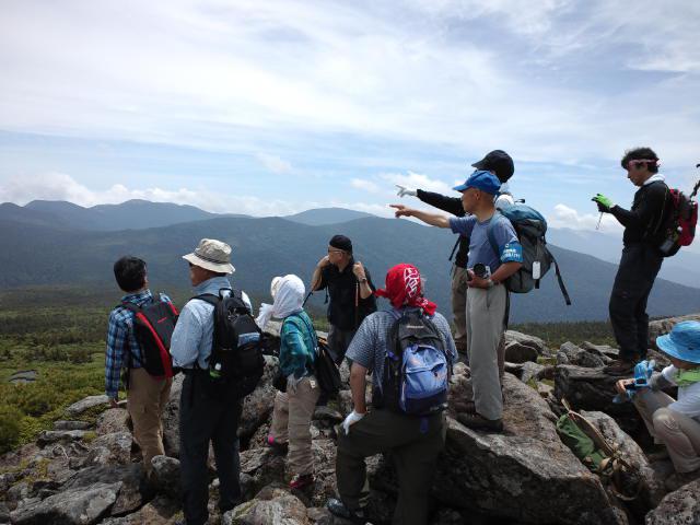 「あっちに見えるのが東吾妻、一切経、家形山 ・・・」