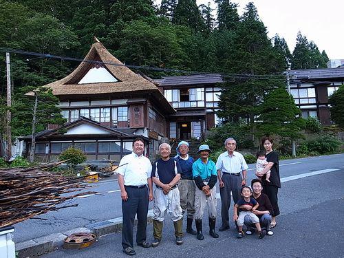 この工事には会津からの5名の職人さんの他に、地元関地区から強力な助っ人を3名頼みました。当館の雪囲いや雪下ろし、山林の管理や水利管理など、外回りの重要な仕事をお願いしている皆様です。