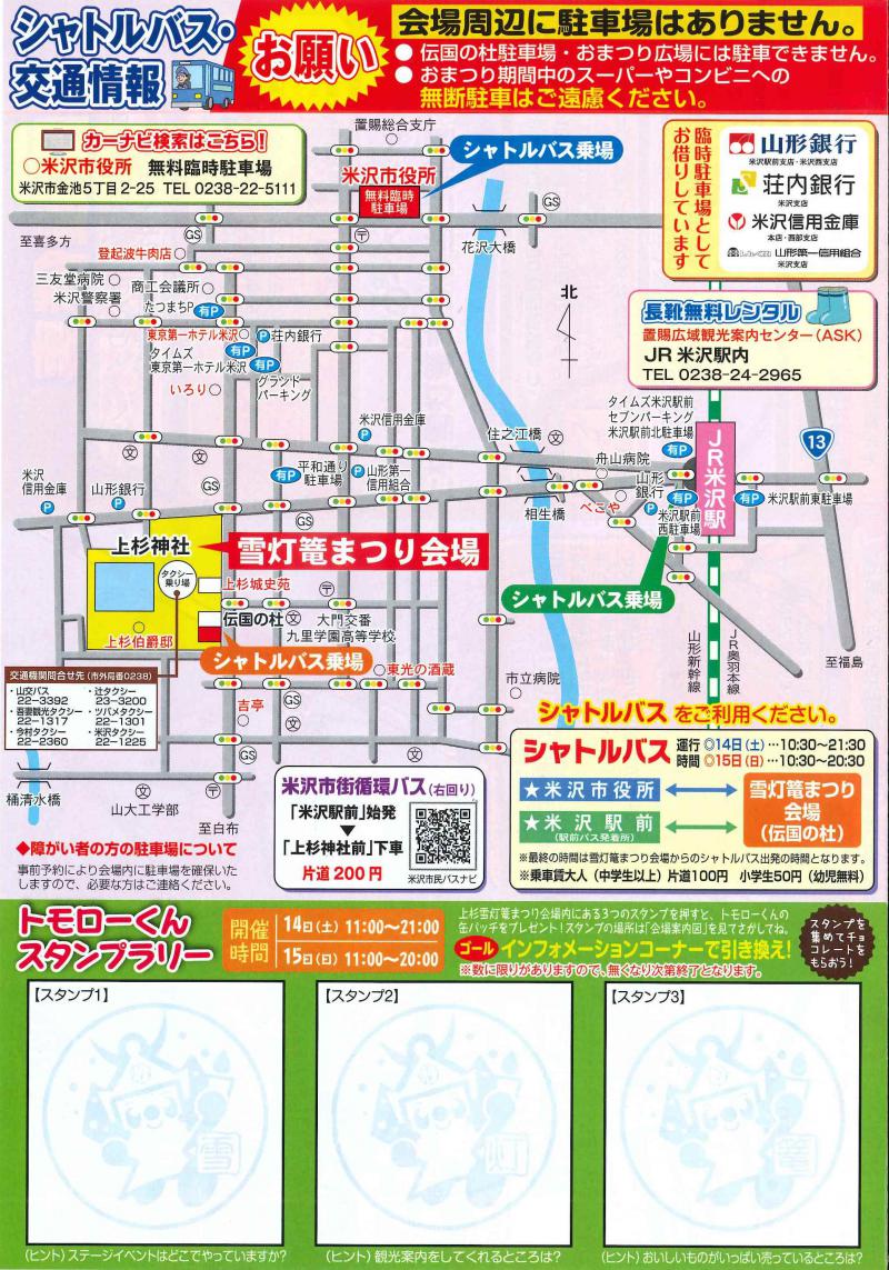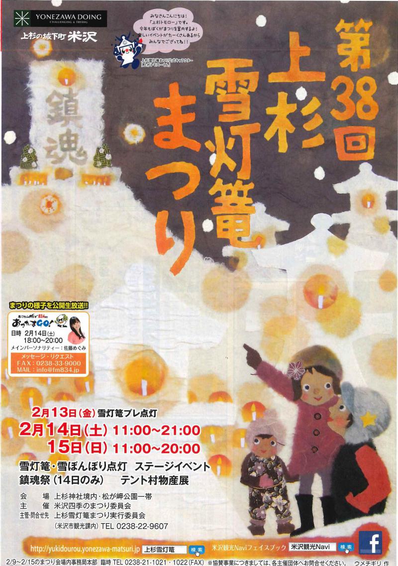 第38回上杉雪灯篭まつりまもなく開催!今年も楽しいイベントがたくさん!ぜひご来場ください!2月13日(金)プレ雪灯篭点灯 17:30〜21:00上杉雪灯篭まつり2月14日(土)11:00〜21:002月15日(日)11:00〜20:00http://yukidourou.yonezawa-matsuri.jp/雪灯篭・雪ぼんぼり点灯 ステージイベントテント村物産展 鎮魂祭(14日のみ)地域コミュニティラジオエフエムNCV公開生放送!鎮魂祭郷土の戦没者慰霊世界の恒久平和を願います。御霊に献灯し、祈りを捧げてください。ろうそく献灯の方には甘酒、こんにゃくのお振る舞い市民アイディアゾーンには市民ボランティアのみんなで作り上げる大きなモニュメントが登場綺麗なキャンドルゾーン働く車にのれば会場を見渡すことが出来ますよ。テント村ではたくさんのあったかい美味しいものが大集合!各会場を回ってオリジナル缶バッジをゲットしよう!ステージイベントではエフエムNCV公開録音19時30分からは雪中打ち上げ花火15日(日)伝国の杜ホールでは戦国武将大集合第4回米沢冬の陣 入場無料!そのほか協賛事業など盛りだくさんの内容で、これを読めば雪灯篭まつりをさらに楽しめること間違いなし!!ご希望の方は郵送させていただきますので、是非お問合せください。なお、公式ホームページではPDFで表示できますので、詳しくは公式ホームページをご覧ください。http://yukidourou.yonezawa-matsuri.jp/