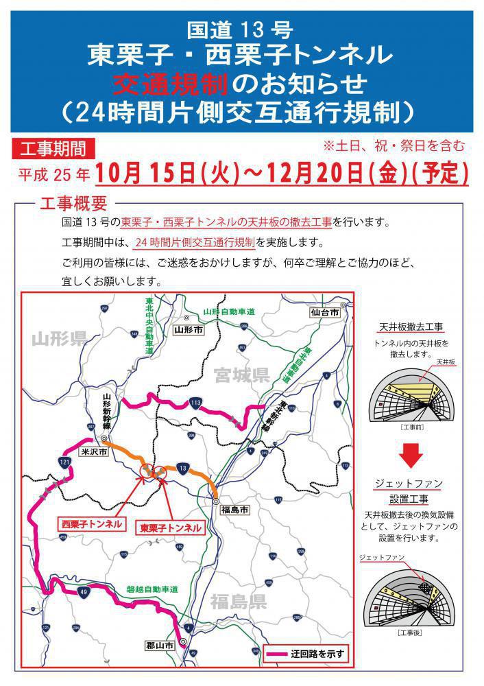 続 交通規制に関する情報です。東北道・福島飯坂IC〜米沢市 ルート13(国道13号)は次の規制があります。http://yamagatakanko.com/log/?l=334644→ リアル情報として30分〜50分のロスタイム発生 磐越道・猪苗代磐梯高原IC〜白布温泉(米沢市)ルート2 【西吾妻スカイバレー】(主要地方道2号)は11月1日〜 17:00〜 夜間通行止め(翌朝8:00迄)11月15日 17:00〜 冬季完全閉鎖※状況により前倒しで閉鎖になる場合があります。