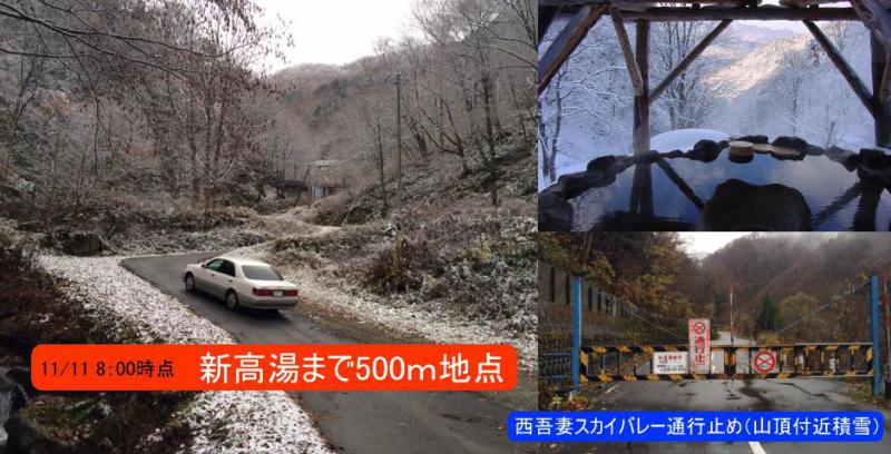 天気予報どおり! (^^)v惜しくも新高湯道路(車道)には積もりませんでした。しかし、西吾妻スカイバレーは山頂付近積雪ということで通行止め。おそらく・・・ 15日の冬季閉鎖を前倒しする可能性大ですね。スタッドレスタイヤの準備、道路交通情報に敏感になる準備、何よりも心の準備、OKでしょうかw準備ができていれば、とことん雪見を楽しめます。なお、積雪期は宿泊の方のマイカーは新高湯1km手前天元台駐車場に置いていただき宿のスペシャル送迎車をご利用ください。いよいよカートレースで磨き上げたドライビングテクニックの出番?!いいごどぉ!