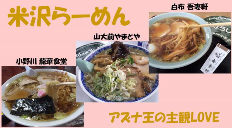 食べ歩きが趣味ではございません(笑)山奥の秘湯から米沢市内へ所用で出かける際に立ち寄るラーメン屋さん。吾妻軒 http://www.0141men.com/member/azumaken/index.html山大前やまとや http://samidare.jp/yamatoya/龍華食堂 http://onsentamago.com/ryuge/いいごどぉ!