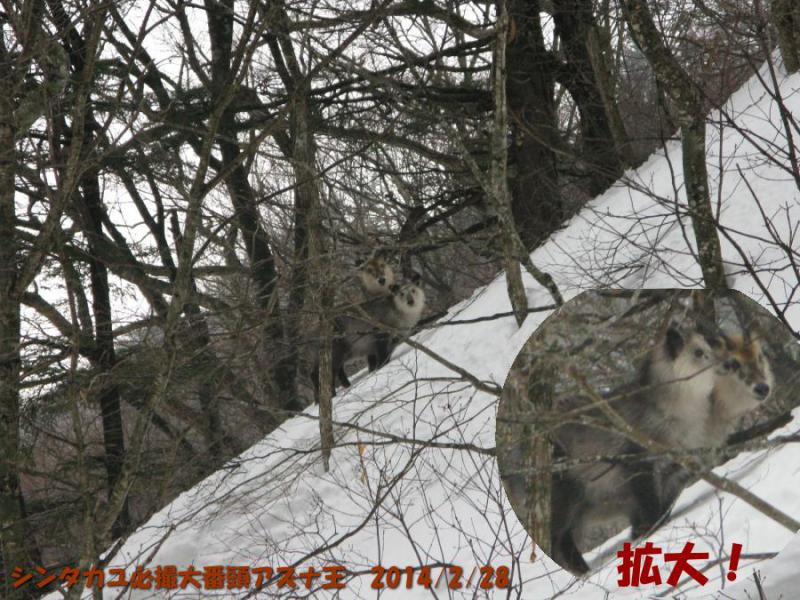 2月28日午前、吾妻屋旅館の宿前に、かもしか登場です。直線距離50メートルの山肌に現れたのを確認し、得意のiphone・・・ 遠い(;・∀・)旧式デジカメを持ち出し、ギリギリ間に合いました。この辺に常に居るのですが、見ての通り保護色^^; しかも、すぐ移動するのでなかなか撮るまで至りません。 今日は、いいごどぉ!山奥の道路も雪解けが進み、4WDであれば余裕でアクセス可能になった昨日今日です。雪見風呂&かもしか見風呂(笑)