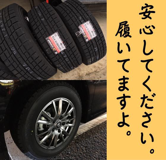 今でしょ って発することが、今更でしょ という年末が近づいて参りました。いよいよ・・・ 今年は遅い? でしょうか、雪積もる季節がすぐソコです。タイヤ交換がまだだった1台を昨日交換しました。【安心してください。履いてますよ。」 そんな看板見かけてもいいかな?!まだ見てないから・・・ きっとこんな感じかな!?雪国へのアクセスにはスタッドレスタイヤ!ノーマルは、アブ(危)ノーマル!!! という季節が、ほら → ソコ(笑)