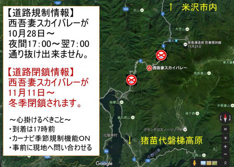 「スカイバレー通れますか?」 その一言を問い合わせ、する。しない。のちょっとの違いが大きな違いになる。その言葉の意味を体感してほしくないというのが私の気持ちです。 【冬季通行止め】11月11日〜翌4月下旬西吾妻スカイバレー(裏磐梯〜白布)の規制に関する情報です