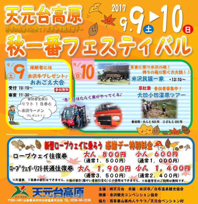 9月9日10日天元台高原市民感謝デー 秋一番フェスティバル開催詳しくは 天元台高原サイトをご覧ください。http://www.tengendai.jp/