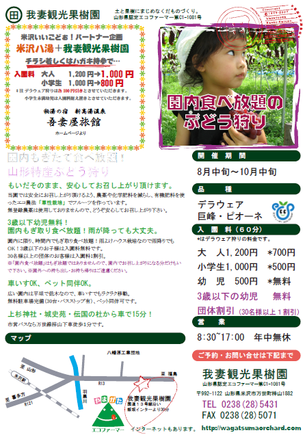 6月中旬〜下旬 まさに、今が、さくらんぼ狩り最盛期なんですが「さくらんぼ」より・・・「ぶどう」というアナタと私のソレです(笑)しかも、巨峰とかピオーネの大粒系です。デザートに1粒、2粒でも充分なアレを1房、2房 果樹園内で食べ放題!ぶどうをお腹いっぱい食べたい! という私も、イメージしてたぶどう狩りってデラウエア等の小粒系でした。 それを裏切る 大粒系のアレです。もちろん、小粒系好きのデラウエアの時期もありますので、その辺はしっかり確認してからの話です。一房、一房 大事に袋が被せてあって、「食べれるだけ 採ってください」という60分を経験しますと、人には是非とも紹介したい! けど自分は・・・(笑)以上、さくらんぼ狩りの次、 ぶどう狩り 9月〜 の予告でした。