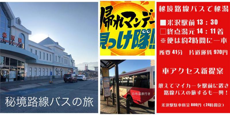 10月21日 テレ朝系 帰れマンデー見っけ隊 秘境路線バスの旅で紹介されました路線がこのバス路線です。東京駅 11:00発の 山形新幹線つばさ135号に乗車しますと米沢駅 13:07着【山形交通路線バス 白布温泉行き】 米沢駅 13:30に乗車しますと終点湯元 14:11着【所要時間41分 片道運賃970円】御宿泊のお客様は、予約時またはバス乗車時にご連絡頂くと終点湯元バス停で宿の送迎車がお待ちして標高1126mの宿へ【所要時間 5分 1kmの山道】翌朝(チェックアウト日)は9:00に宿を出発し、 始発バス停(湯元)9:20発にお送り。※元旦(1/1)は、路線バスが終日運休※路線バスは2時間に一本。ご紹介したのはオススメかつ一番利用の多いパターンです。