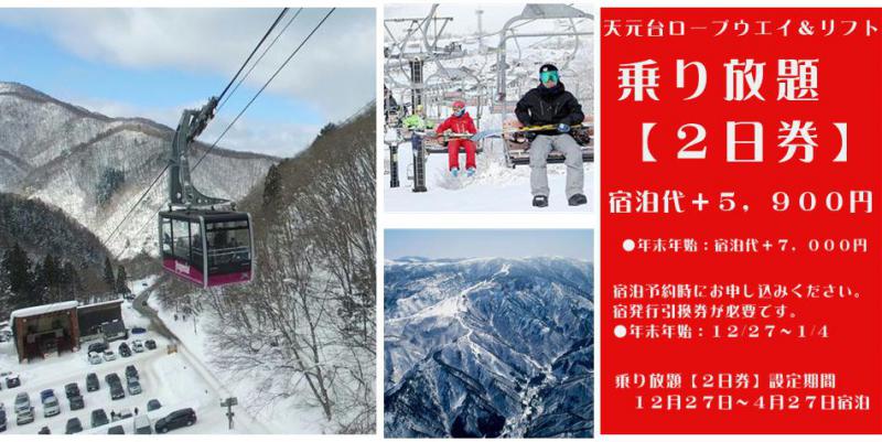 宿泊+2日券のねらい。まるまる2日間滑り放題されても結構です。半日+半日でも、1日+5時間、1時間でも宿泊するなら2日間またいで欲しい。それを推奨する値付けです。(^_-)-☆ 天元台ロープウエイ&リフト乗り放題案内