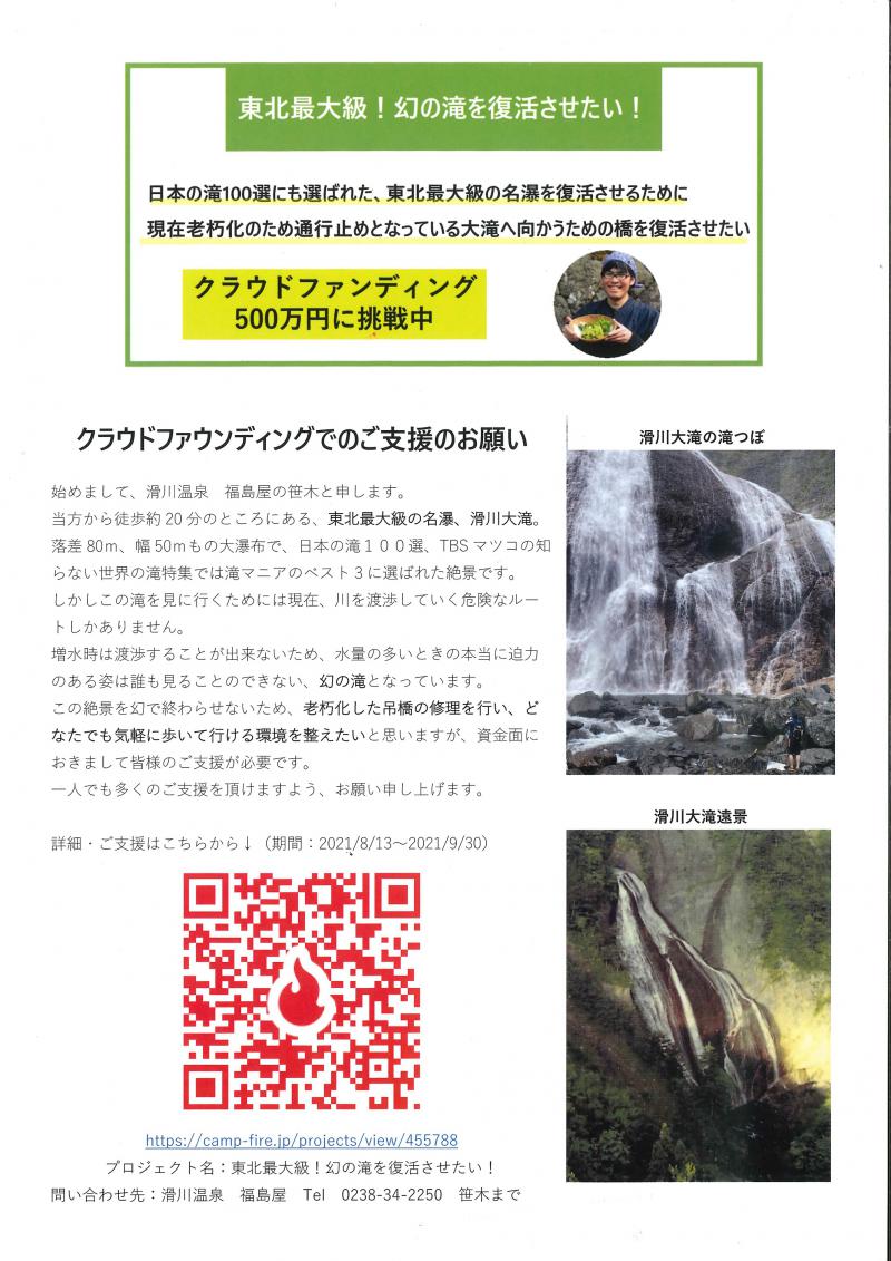 皆様の力をお借りして吊橋を修理し、再び滑川大滝が見られるようにしよう!